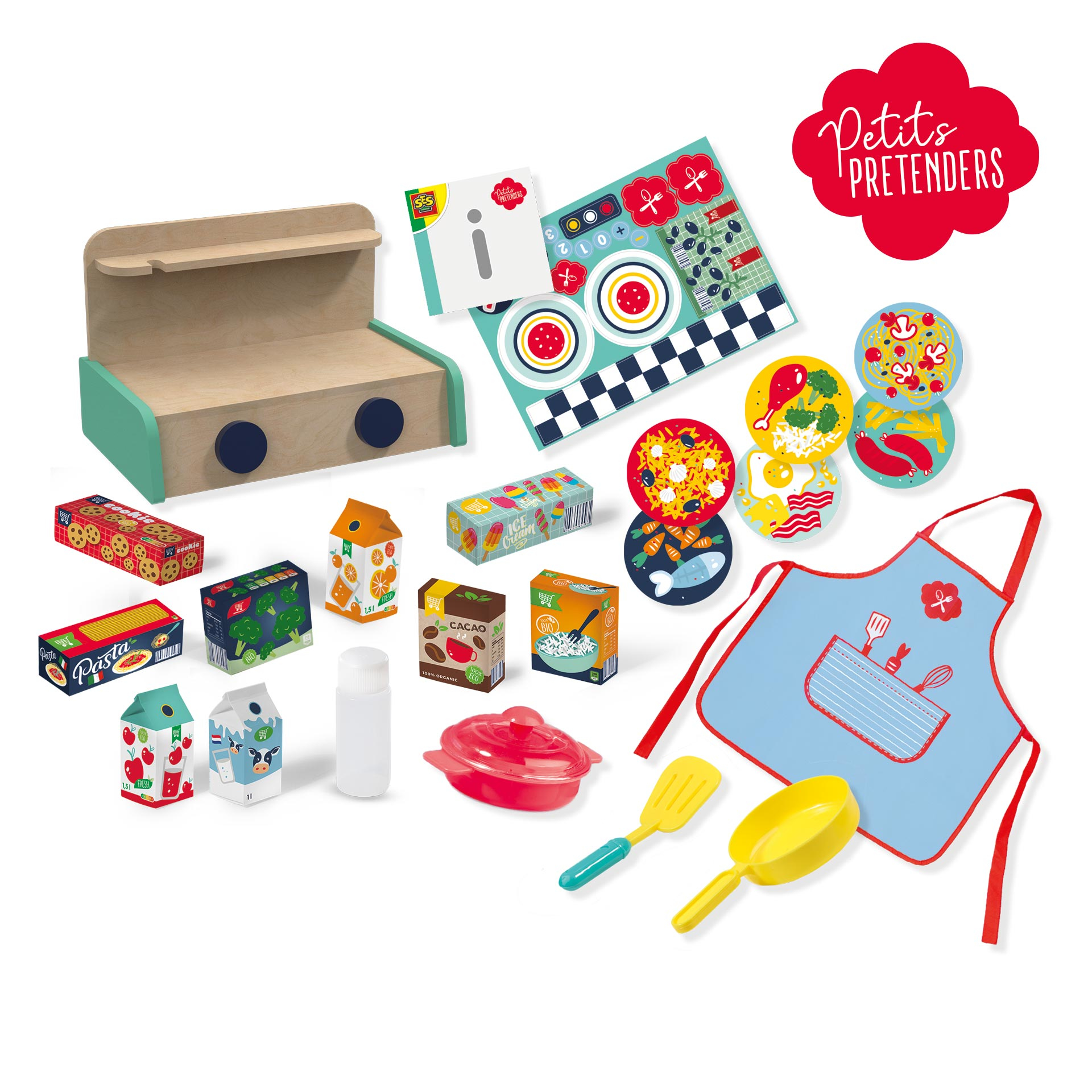 This comprehensive set of wooden kitchens from the Petits pretenders line from SES includes everything you need to help at home in the kitchen or start your own restaurant. Put on your chef’s apron, we’re hungry! Prepare the most delicious dishes in the two pans, choose from the 9 tastiest ingredients and products and cook your own 3-course menu. What’s your favourite dish? Nice for playing together with friends.