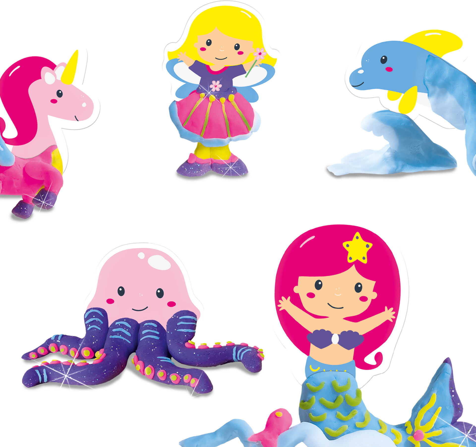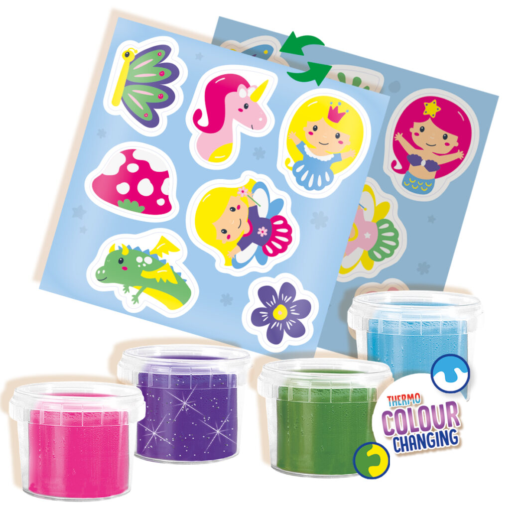 Tu aimes les contes de fées ? Ce kit contient deux pots de pâte à modeler spéciale qui changent de couleur. C’est la chaleur de tes mains qui modifie la couleur de la pâte à modeler ! Le kit comprend également des pâtes à modeler pailletées et fluo. Ces quatre couleurs spéciales et les personnages amusants donnent vie à tes contes de fées !