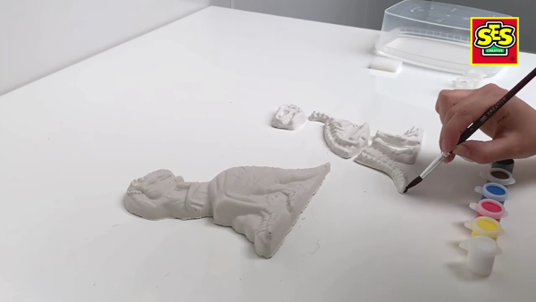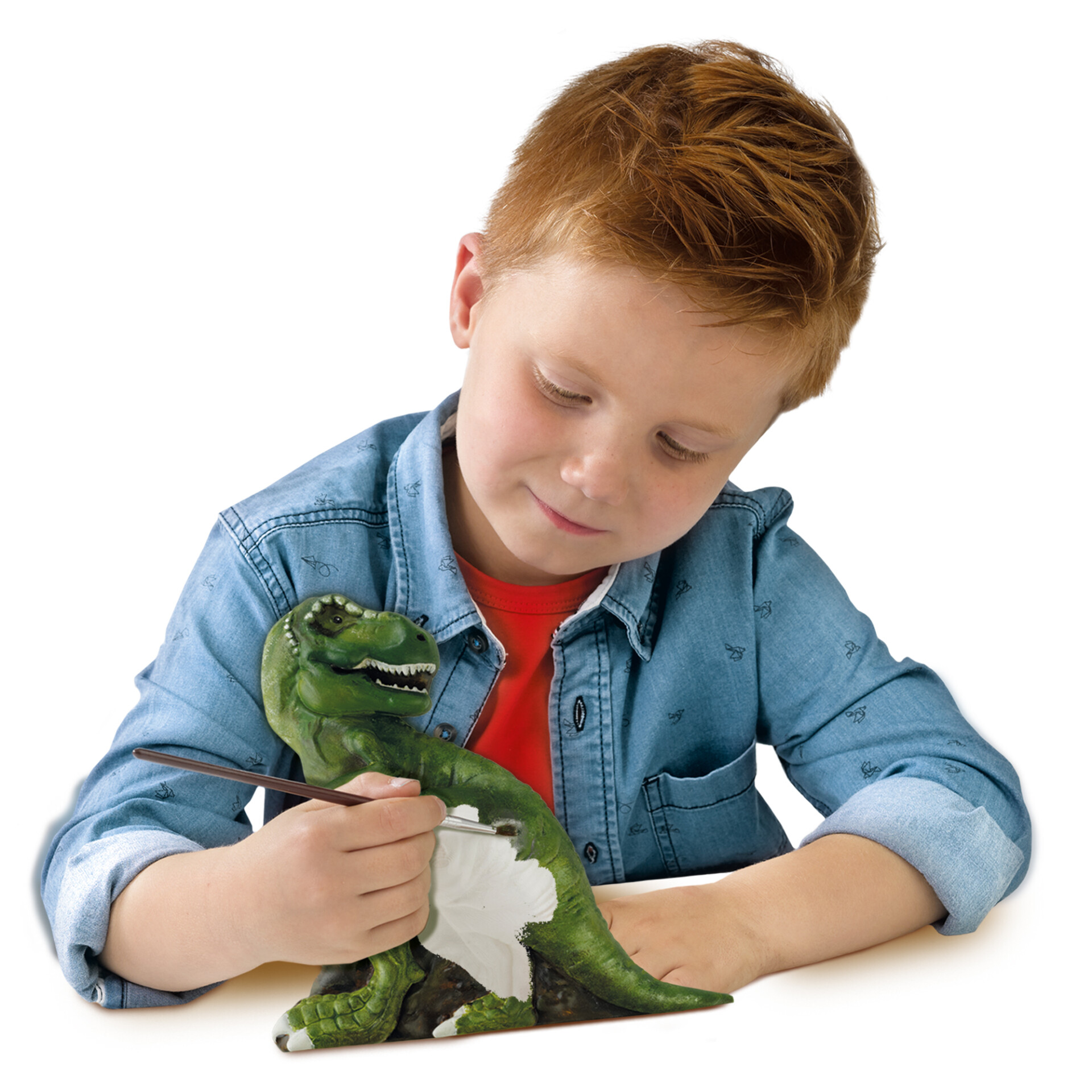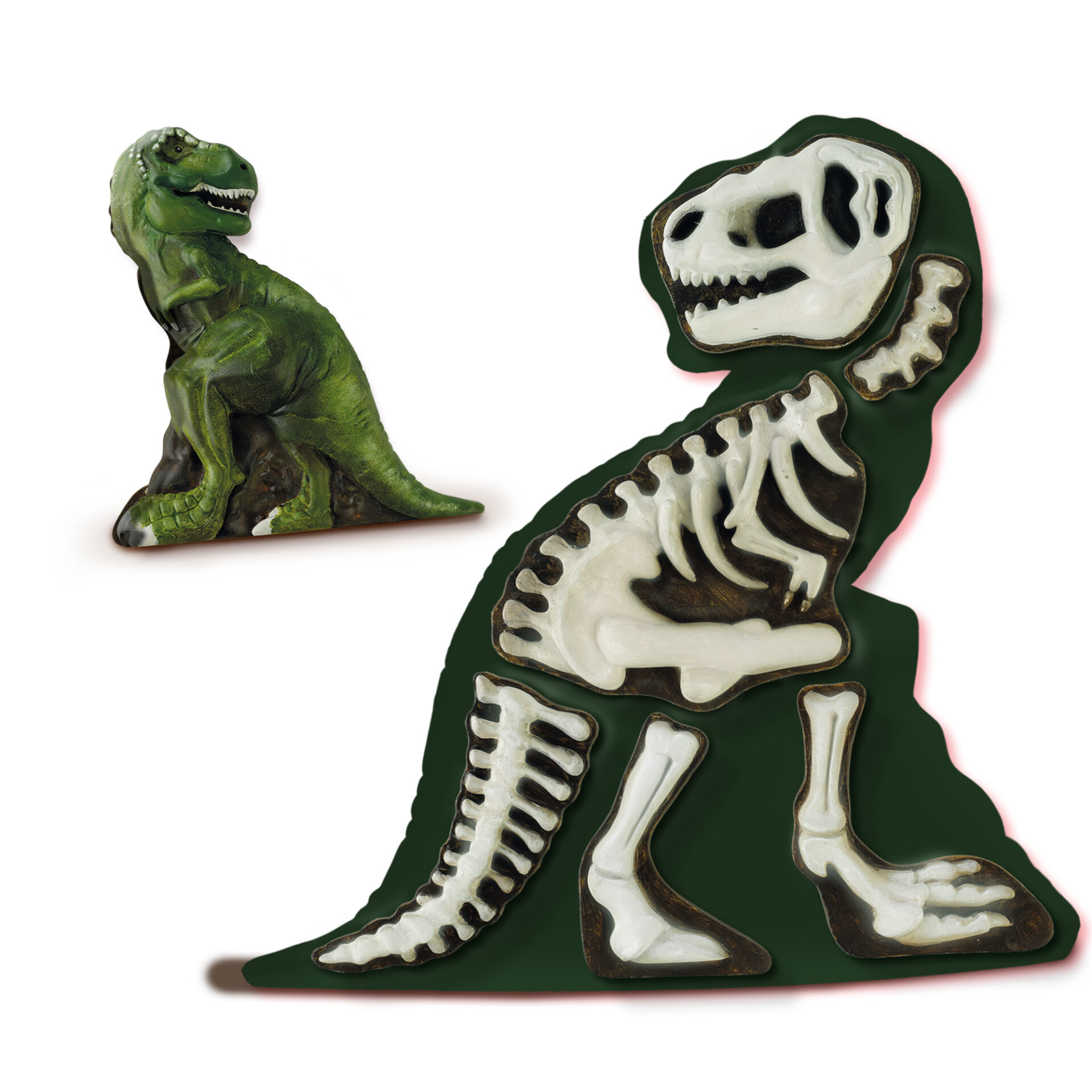Met deze gave dino set met gips van SES Creative maak je wel een hele bijzondere T-Rex. Aan de ene kant van het beeldje is het een gedetailleerde T-Rex, terwijl je aan de andere kant zijn skelet ziet! Giet de onderdelen in de mal en beschilder ze na het drogen met de gekleurde- en speciale Glow in the Dark verf. Door het meegeleverde sponsje te gebruiken krijgt de dino snel een mooie textuur. Zet je zelfgemaakt kunstwerk in je kamer en zie ’s nachts het skelet oplichten in het donker!